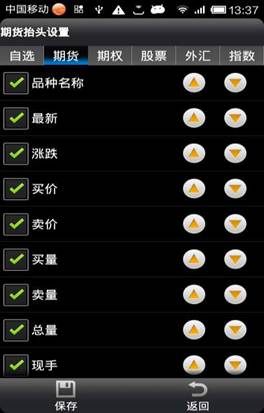◇ 設置自選、期貨、期權、股票、外匯、指數等六大市場顯示的抬頭字段及字段的順序。