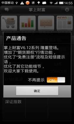 ◇ 顯示通告:設置掌上財富軟件登錄后是否顯示通知消息框,默認為“顯示通告信息”,