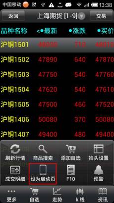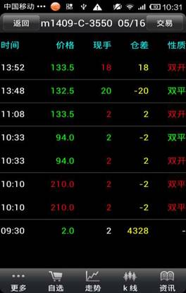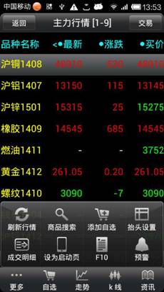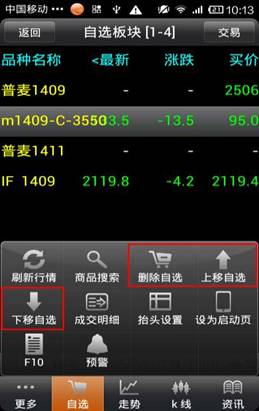 品信息,點擊“更多”可以商品搜索,刪除自選、上、下移自選,成交明細,抬頭設置,