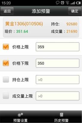 ◇ 可以對價格上限,價格下限,持倉上線,成交量上限做預警設置,價格上限和價格下限